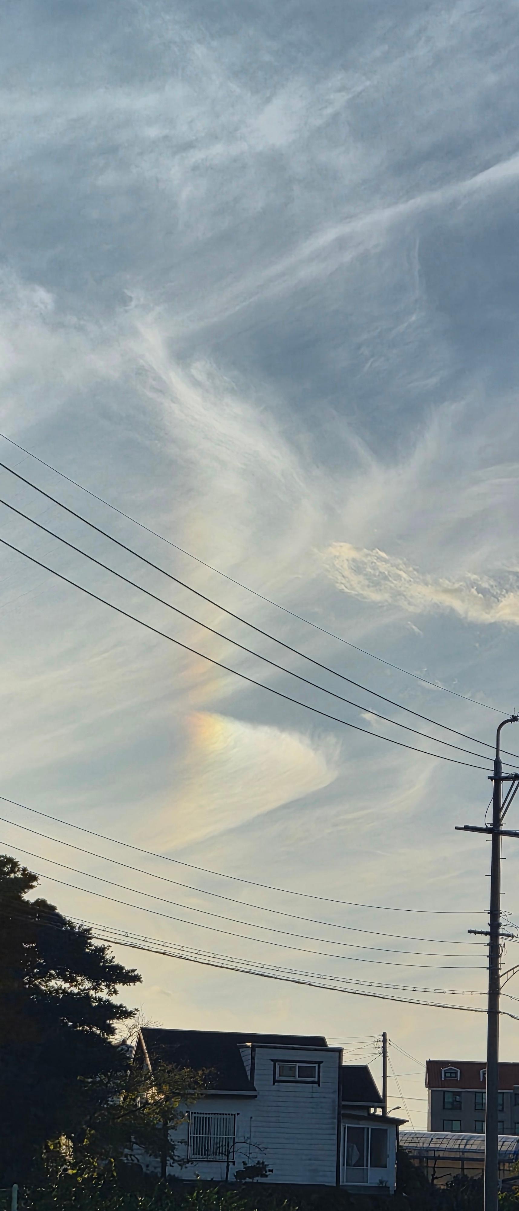 구름 한 부분만 색이 번진 듯 보이며, 태양 근처에서 나타난 것이 특징적이다.